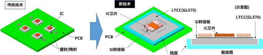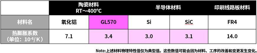 京瓷开发的低热膨胀陶瓷基板材料GL570,热膨胀系数与Si接近,同时又具有高刚性,是适用于高性能计算机群(HPC)中大型化IC芯片或Si转接板的一次封装,且能确保可靠性的材料。