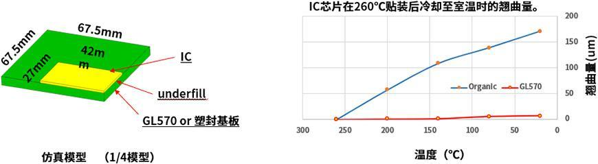 高刚性的陶瓷基板可以缓解一次封装时的热应力,同时抑制IC芯片・Si转接板的形变。除此之外,结合GL570的另一个特征----低热膨胀系数,可以实现更高水准的一次封装可靠性。