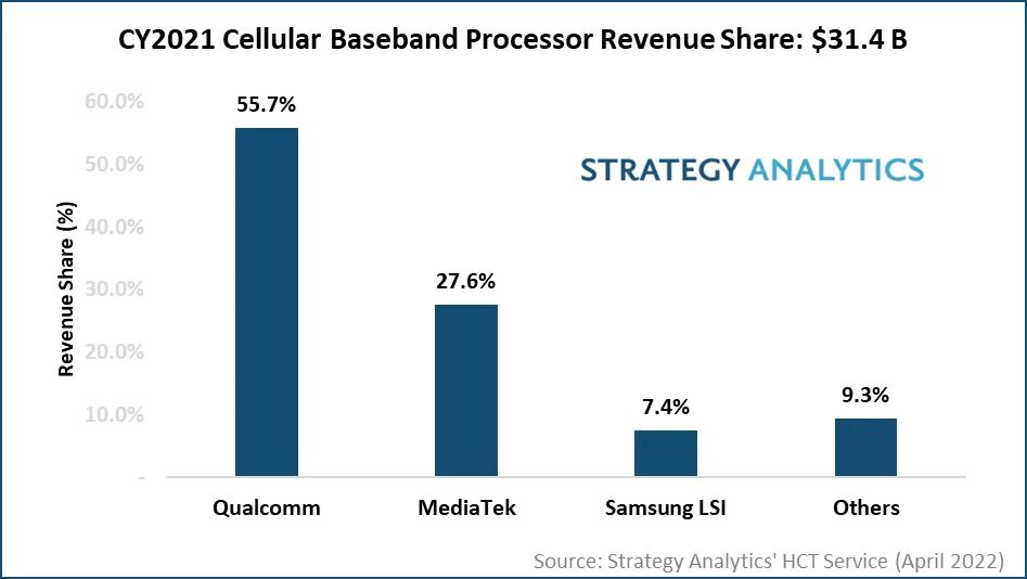 Strategy Analytics手机元件技术(HCT)最新发布的研究报告《2021年Q4基带市场份额跟踪:高通和联发科共同抢占95%的5G市场份额》指出,2021年全球手机基带处理器市场收益同比增长了19.5%,达到314亿美元。高通、联发科、三星LSI、紫光展锐和英特尔占据了2021年基带芯片市场收益份额的前五名。
