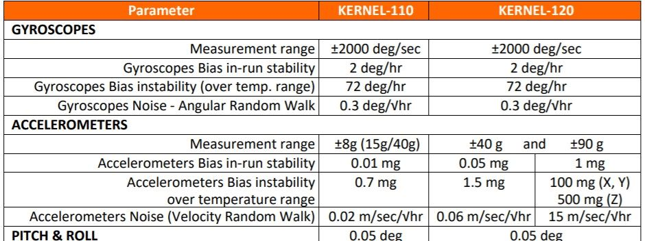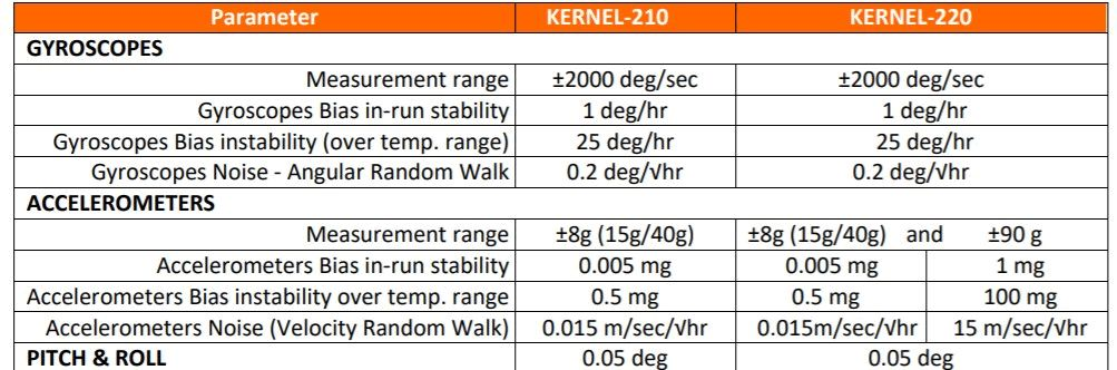 Kernel-210和220 IMU主要参数