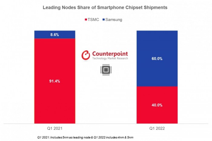 与2021年第一季度相比,全球智能手机芯片组市场的出货量下降了5%,而同期的收入增加了23%。有趣的是,从台积电采购的芯片组的数量在年度基础上下降了9%。2022年第一季度,在高通骁龙8代的推动下,三星在智能手机芯片这一单品的份额方面占据了优势,达到60%。