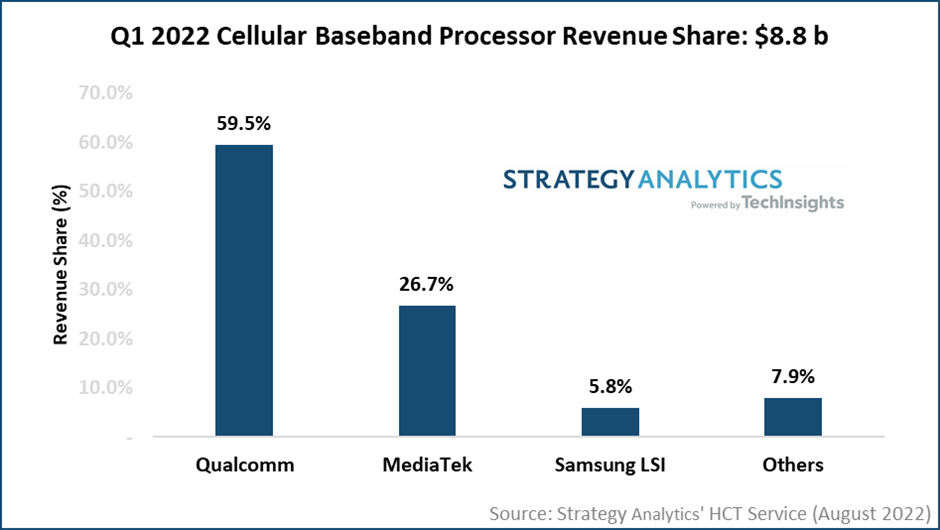 5G继续成为增长引擎。连续九个季度,蜂窝基带处理器市场实现了两位数的收入增长。2022年Q1,基带营收增长20%至88亿美元,而单位出货量下降6%。