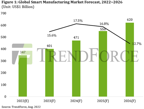 据TrendForce调查 ,企业正在积极推进节能减碳。短期内,自动化作为智能基础的引入将越来越受到业界的关注,而远程操作、虚拟现实、模拟操作等新兴市场的需求在中期内将变得更加实用。这一发展阶段有望解决工业4.0进展缓慢的困境,加快相关技术的发展,到2026年带动全球智能制造市场规模达到6200亿美元。
